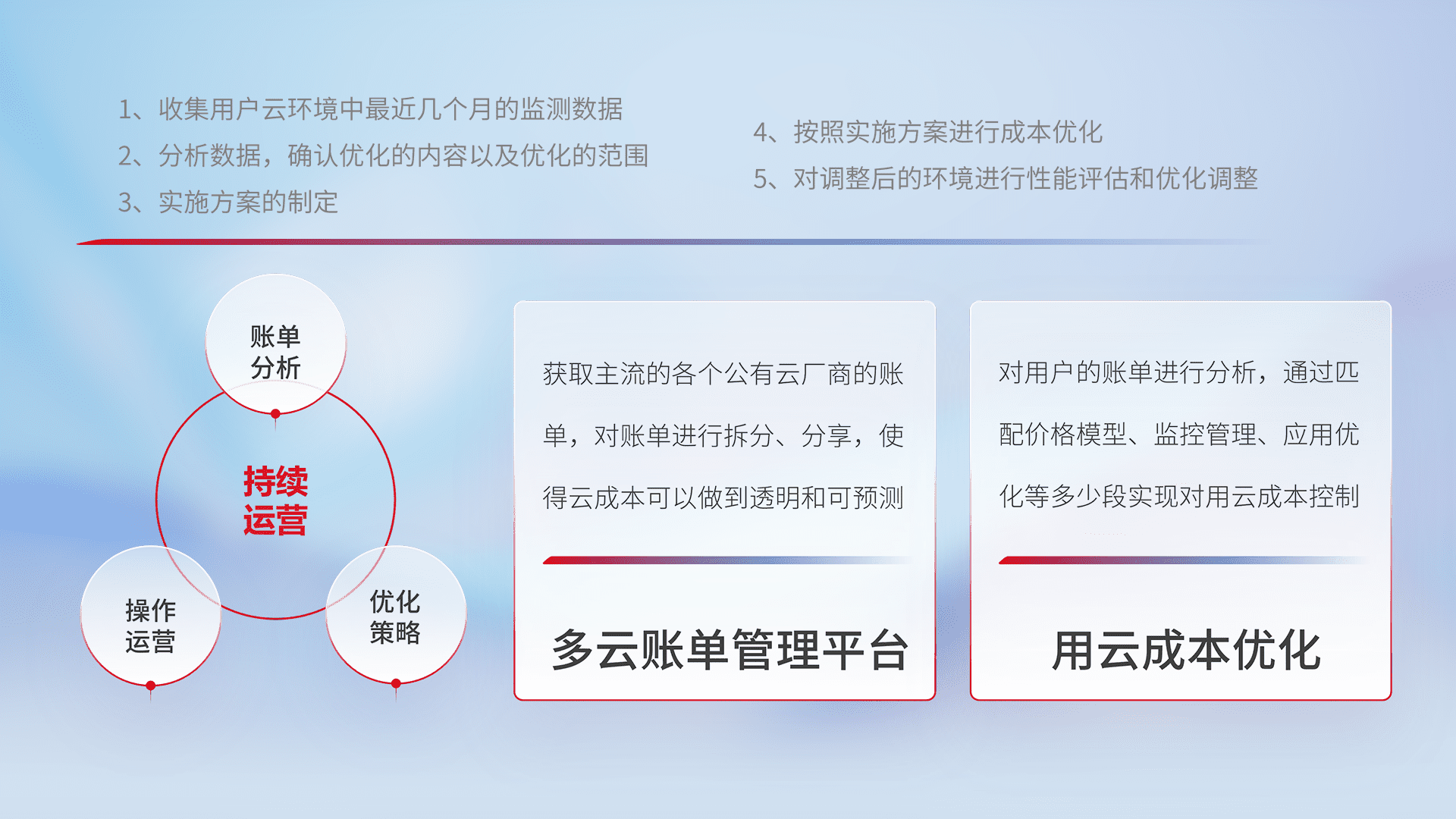 通过多云纳管,,,以统一的资源数据模型把客户的云资源进行抽象和封装,,,进而实现对多云资源的统一操作,,保障云资源管理的可靠性、、、、稳定性与可用性。。量身定制化运维内容,,,配置、、开发运维、、、、补丁管理、、、备份、、监控、、认证和访问管理、、、审计和日常巡检等,,,保障在用云过程中的可靠度,,,,稳定度以及高可用率。。